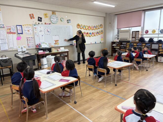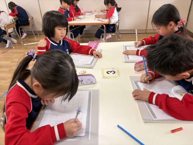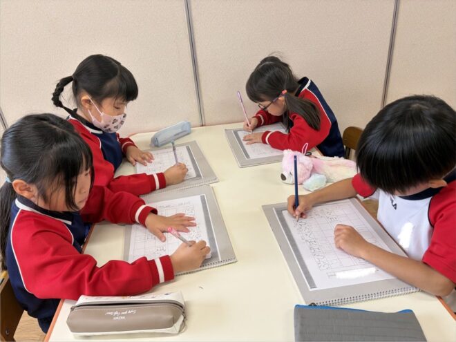 毎月1回、小畠先生による硬筆教室があります。鉛筆の持ち方や書く時の姿勢などの確認から始まり、ひらがなの練習をしています。