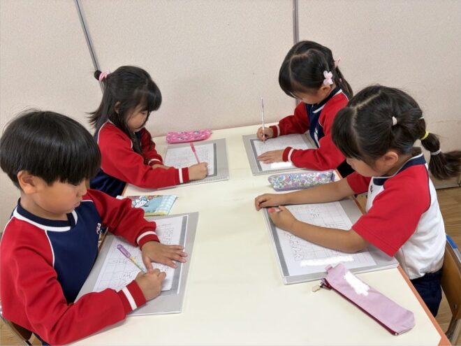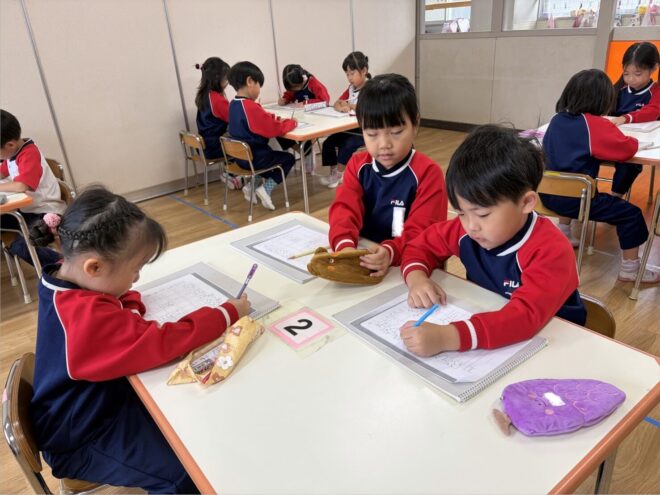 みんな自分の名前を上手に書けるようになりました。終わった後のご褒美シールに大喜びの子どもたちです。