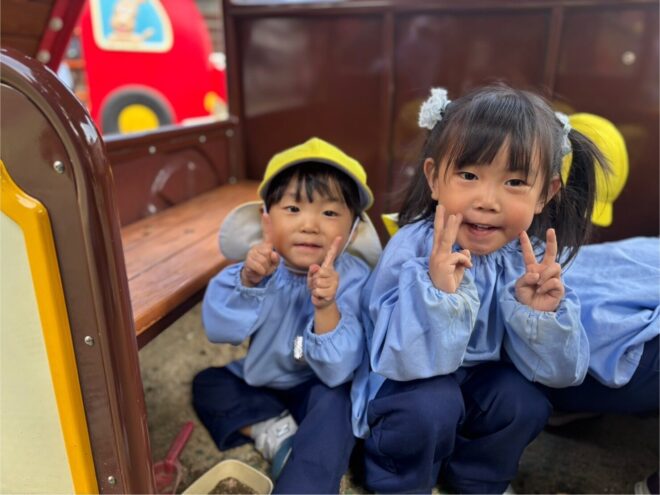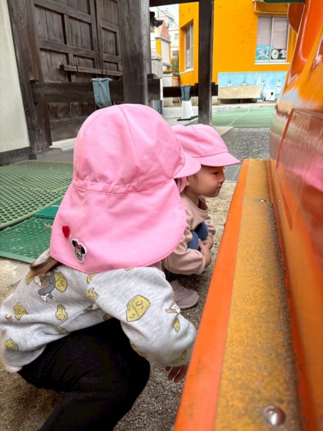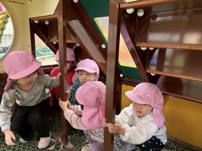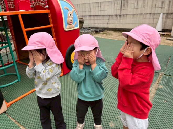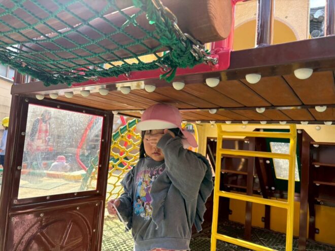 最近のブームはかくれんぼです。「しーっ」と静かに遊具の影に隠れ、見つかると「キャー!」と大盛り上がりで楽しんでいます。