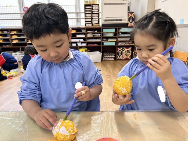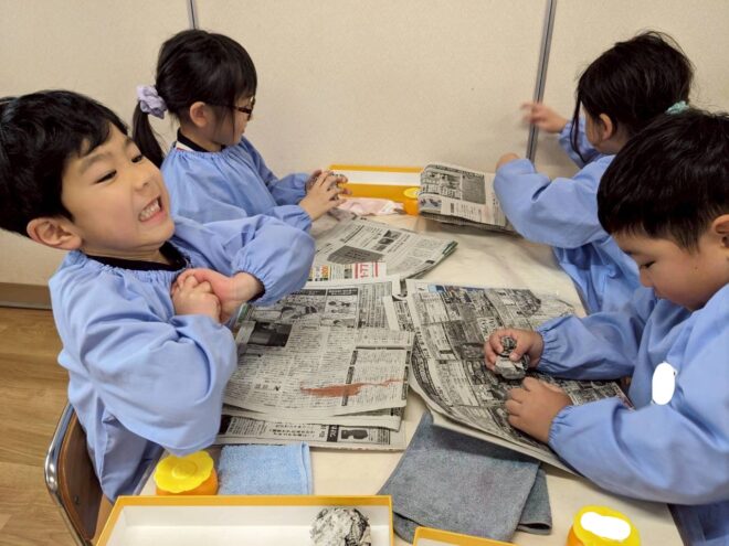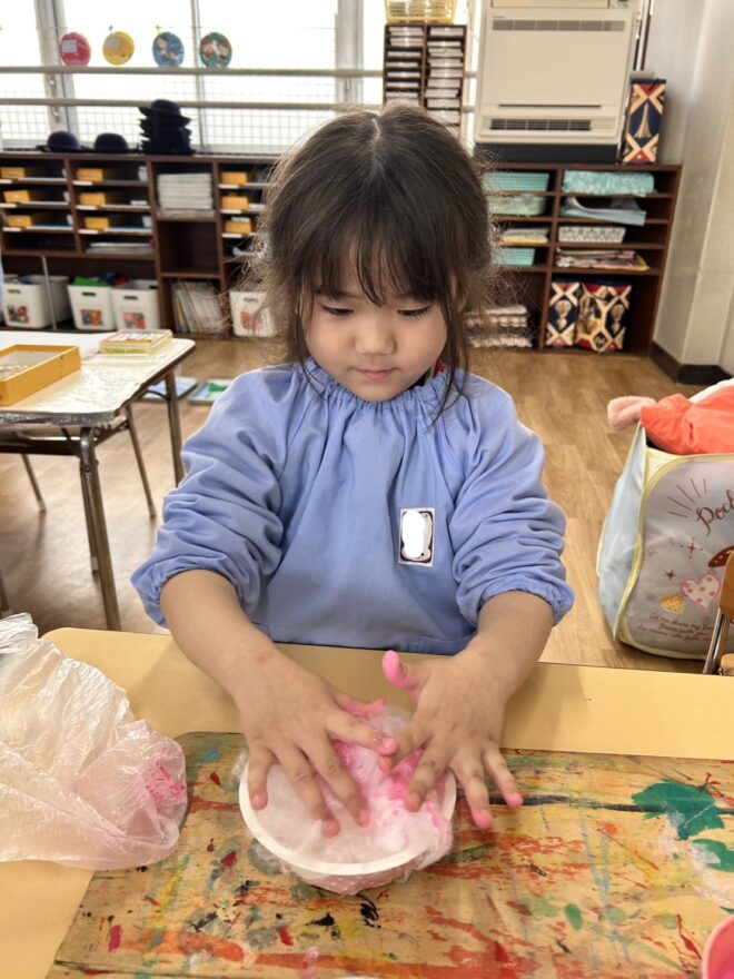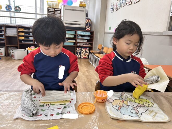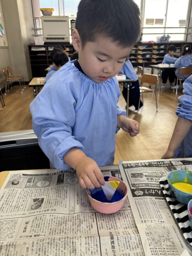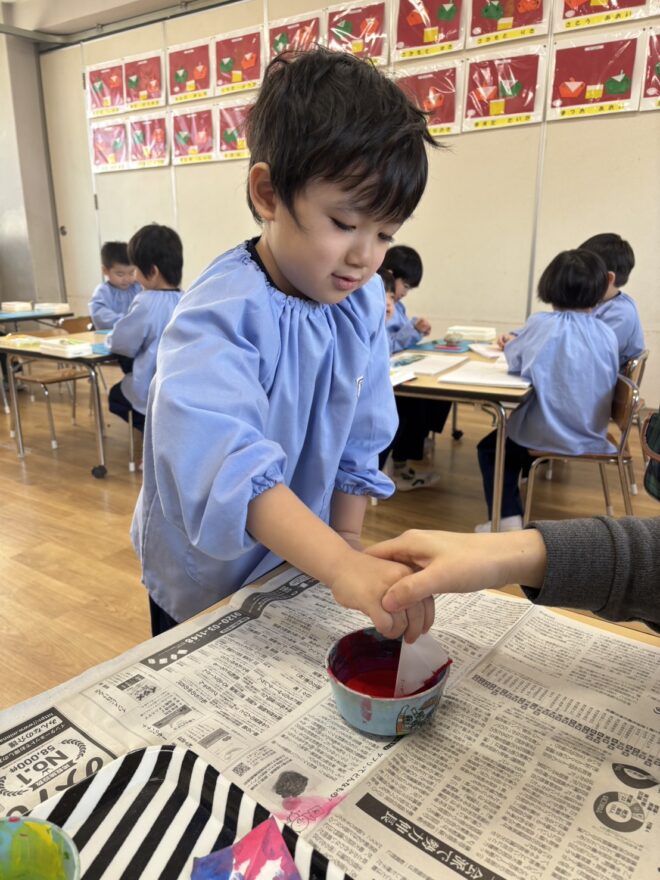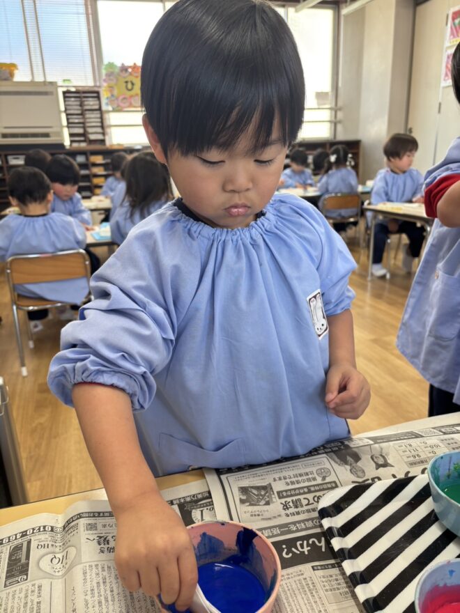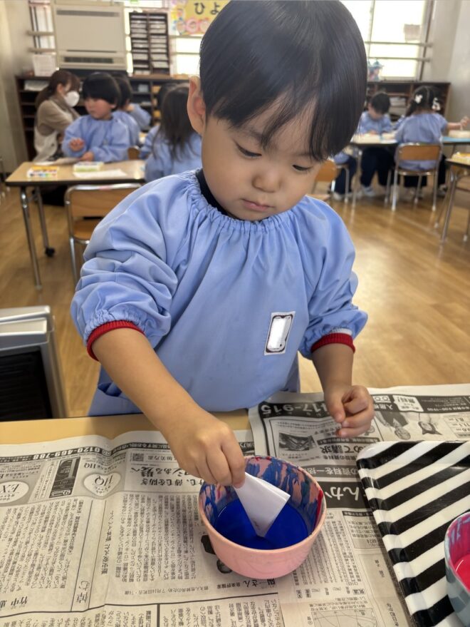 好きな色を3色選んで、そーっと浸す作業でしたが、半紙に絵の具が滲むのが楽しかったようでした!