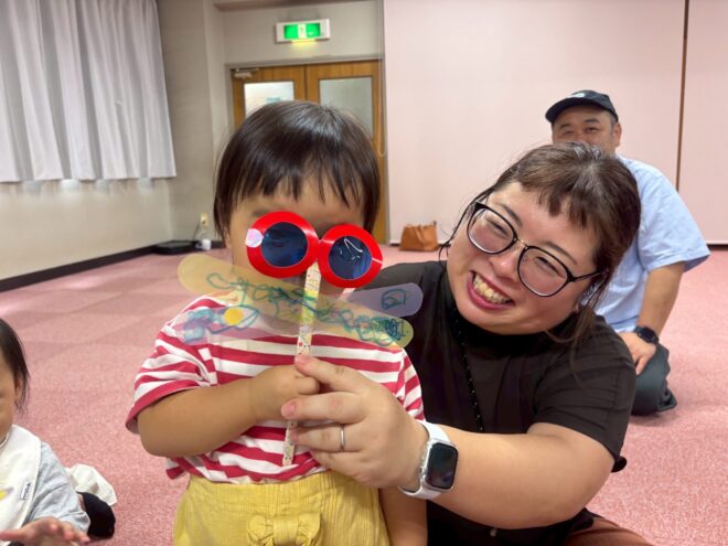 運動会ごっこで体を動かして、トンボのメガネを作りました。