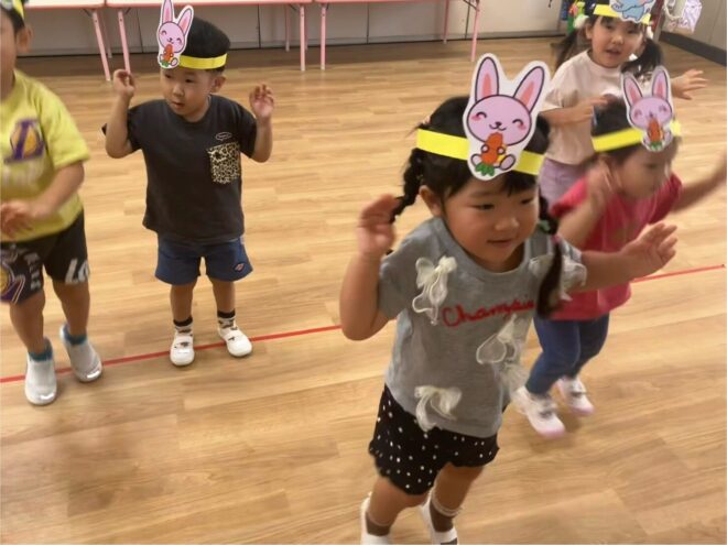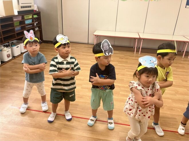 色々な動物になりきって、運動会で踊るどうぶつ体操の練習をしています。